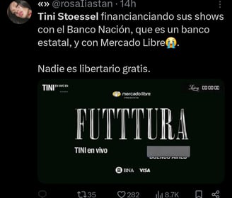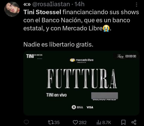 El anuncio de Tini Stoessel sobre su concierto "Futttura", programado para el 24 de octubre, desató una fuerte polémica debido al patrocinio del Banco Nación y Mercado Libre, vinculados al gobierno. A su vez, el evento se realizará en Tecnópolis, un predio administrado por el Estado, lo sumó más críticas sobre el vinculo político de la artista.