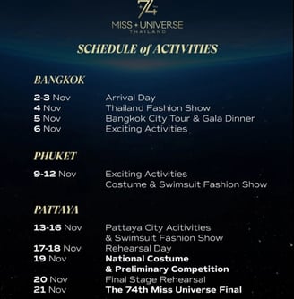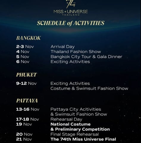 Las representantes llegará, a Bangkok entre el 2 y 3 de noviembre, el 9 llegarán a Phuket y el 13 a Pattaya donde será la coronación el día 20 de noviembre.