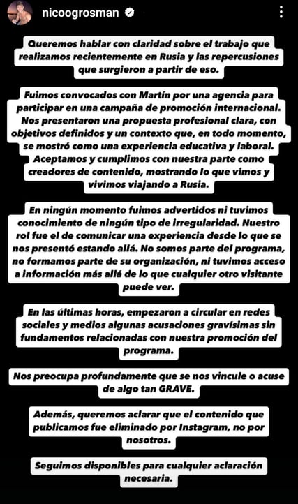 Ante las repercusiones, Grosman realizó un comunicado intentando desligarse de lo ocurrido y afirmando que solo comunicaron su experiencia de lo vivieron en el viaje.