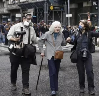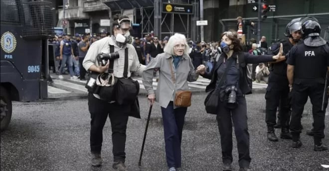 Una de las primeras imágenes que se viralizó de la violencia policial fue la de una jubilada que estaba con una caña y fue empujada por un efectivo de la policía que la dejó en el suelo sangrando. La mujer se encuentra en grave estado.